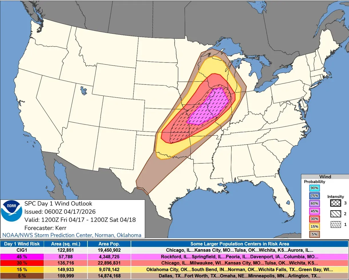 This is the Wind Damage Outlook Map. There is a 45% chance of a severe wind report in the magenta-colored area. The red 30% outlook area runs from Oklahoma to Lake Michigan. The 15% chance comes into the corner of southwest Michigan.
