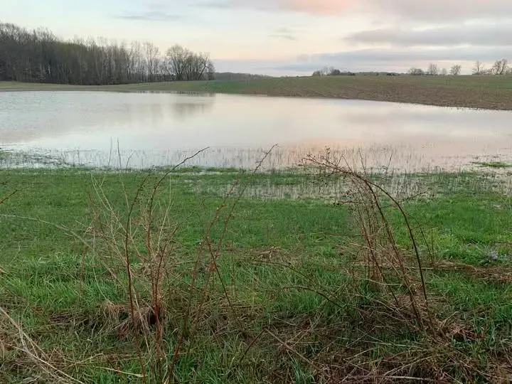 I’ve been walking here for years, and this picture (taken Thursday, April 16) is the biggest I have ever seen. I’d say it covered more than an acre and was probably 2 feet deep in the middle. It’s become the home for numerous ducks and geese. This is the largest of several temporary ponds in the fields south and east of the field. Creeks in the area were bankfull.