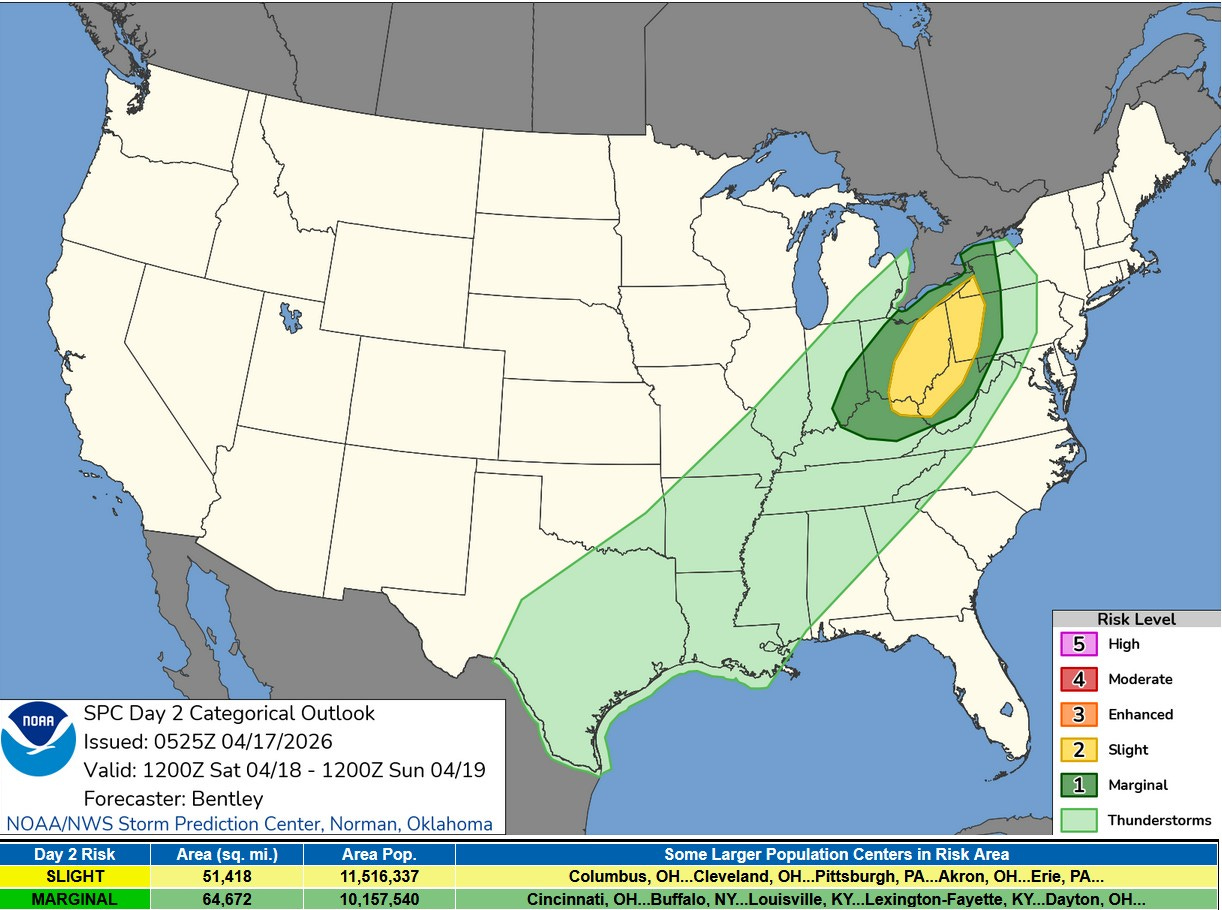This is the Severe Weather Outlook Area for Saturday. The last storms will likely be non-severe as they exit Michigan, with the storms intensifying again in Ohio and Pennsylvania.