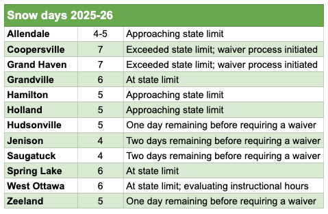 As snow days pile up, Ottawa County school districts might need state approval for more