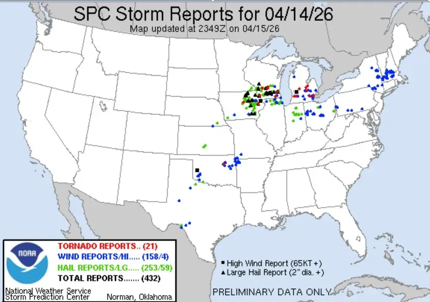 This map shows the plotted location of tornadoes, large hail and wind damage in the contiguous U.S. from 7 a.m. Tuesday, April 14, to 7 a.m. Wednesday, April 15.