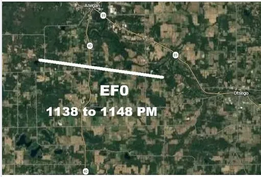 Here’s a map of the first tornado, which started four miles southwest of Allegan. It moved a little south of due east, crossing M-40 and lifted 4.25 miles west northwest of Otsego, coming close to the Bittersweet Ski Area. Peak winds with this storm were estimated to be 80 mph. The storm downed dozens of large trees and power lines on its 6.5 mile path. It was approximately 100 yards wide, or as wide as a football field is long.