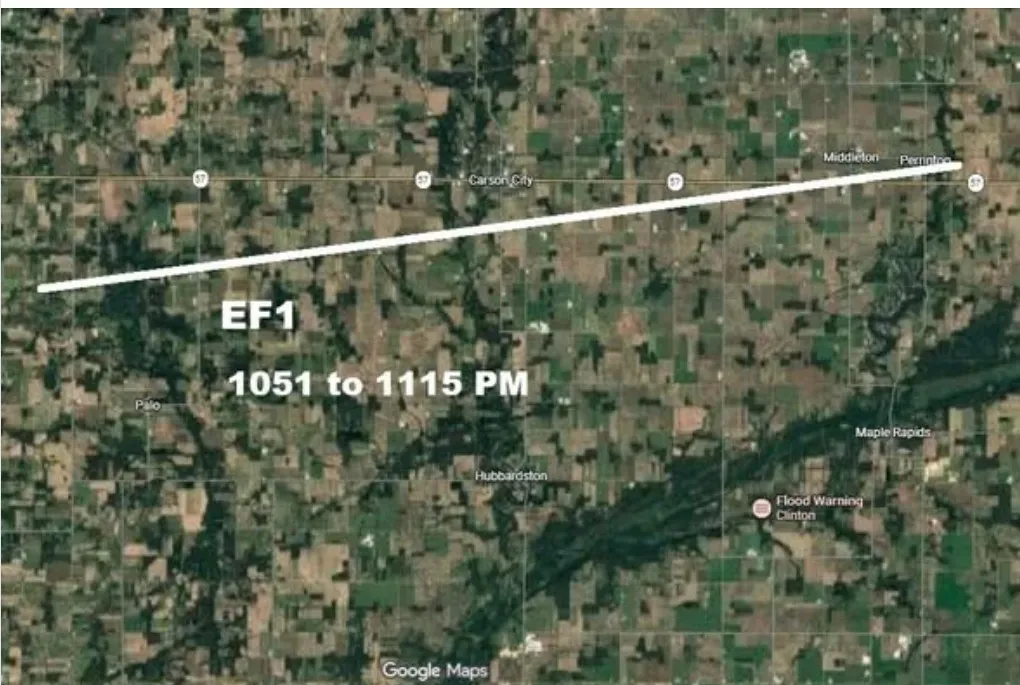 The third tornado was a strong EF1 with winds of 110 mph. Now, 111 mph is EF2, so this was a significant tornado. It was on the ground for 24 minutes and covered 18.75 miles, starting near the town of Fenwick and ending a little past Perrinton shortly after it crossed M-57. This twister also traveled at about 45 mph. Over a dozen barns and outbuildings were damaged or destroyed, and about 10 homes had roof damage.