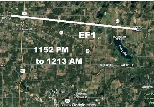 The second tornado started shortly after the first tornado lifted. This twister was an EF1 with 100 mph winds. It was on the ground for 16 miles, starting just north-northeast of Otsego and continuing all the way to Hickory Corners. The tornado crossed US-131 and put debris from a nearby building across the highway, resulting in a traffic jam in both directions. It was 175 yards wide. Dozens of buildings were damaged along the tornado’s path. The tornado was moving at approximately 45 mph.
