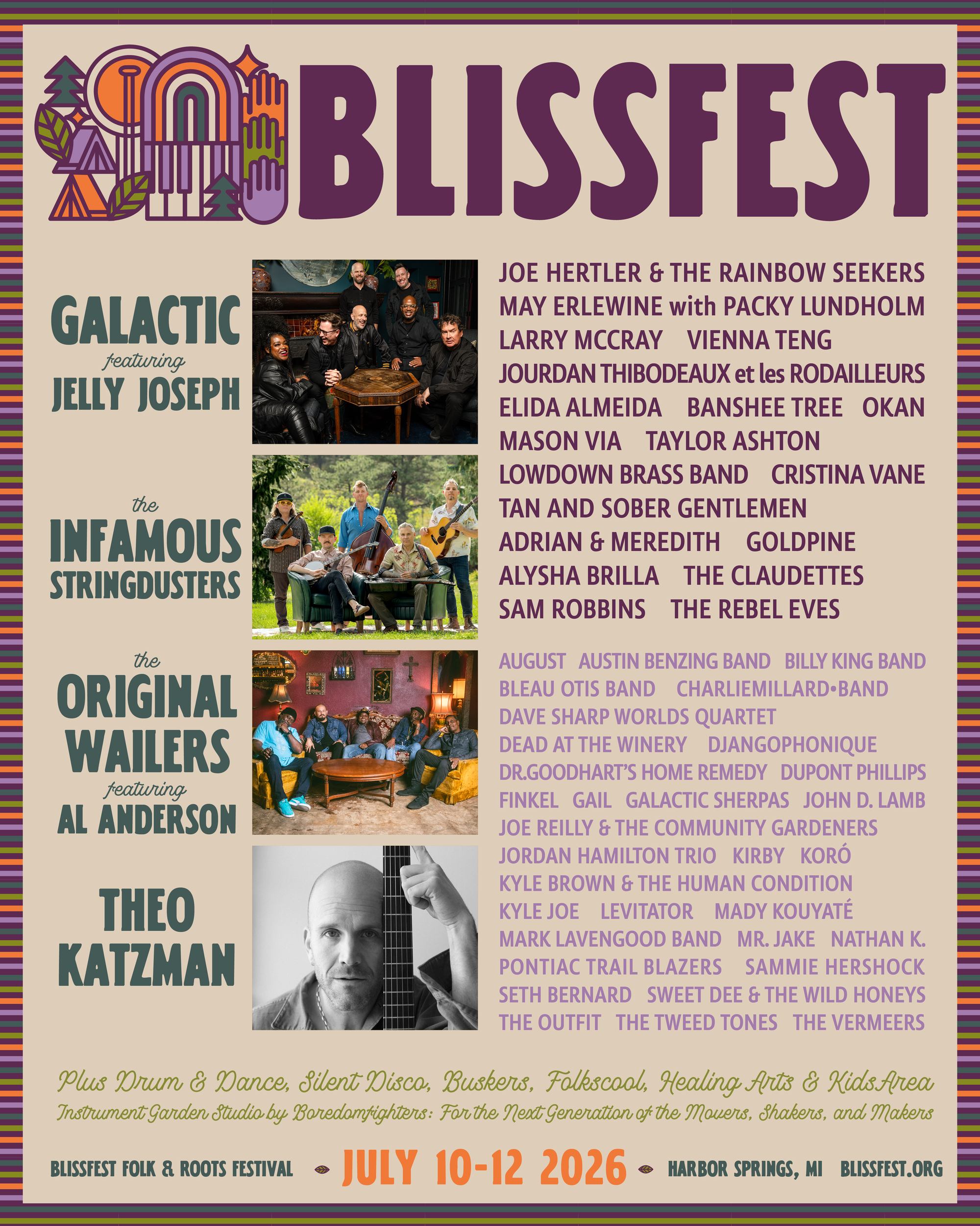 Blissfest, the iconic festival taking place July 10-12 outside Cross Village, has announced that Galactic with Jelly Joseph, The Infamous Stringdusters, The Original Wailers featuring Al Anderson and Theo Katzman will headline this year’s celebration, with Michigan favorites Larry McCray, May Erlewine and Joe Hertler & The Rainbow Seekers also on tap.