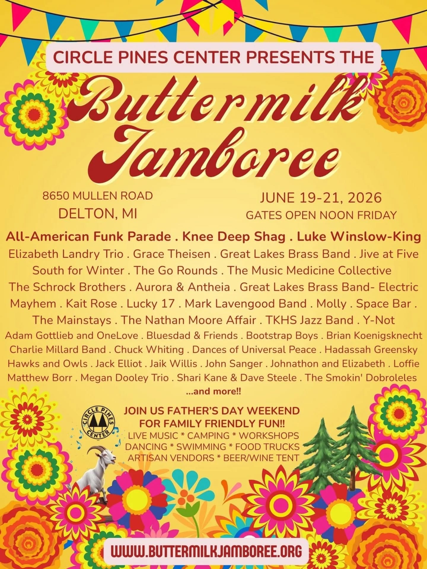 Buttermilk Jamboree at Circle Pines Center south of Grand Rapids, which has reveled in family-forward celebrations of regional music since 2011, will spotlight more than 40 Michigan acts June 19-21, led by All-American Funk Parade, Knee Deep Shag, Luke Winslow-King, The Go Rounds, Great Lakes Brass Band and Y-Not.