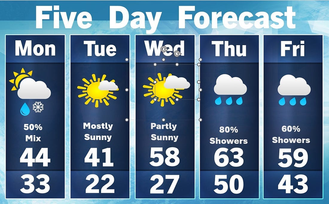 - Thursday: Mostly cloudy and windy with a couple of showers, with a high of 63 degrees. Showers will continue, with a low of 50 degrees.