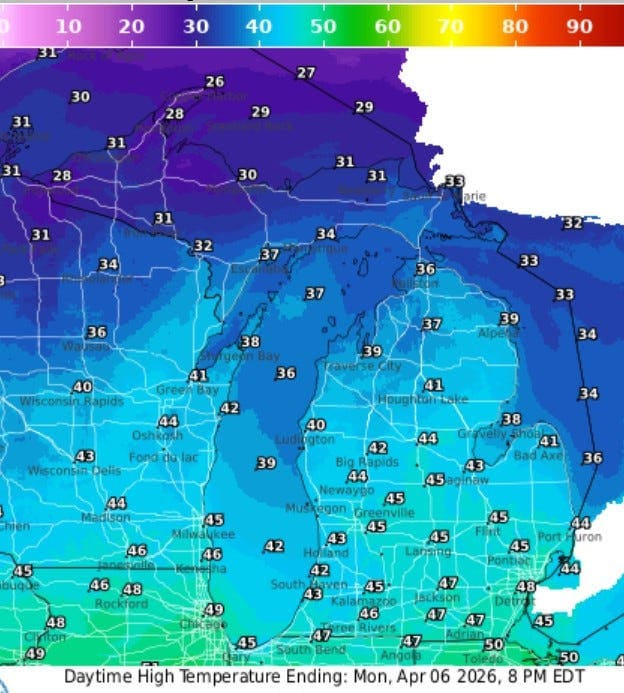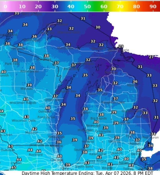 Here’s high temperatures for Tuesday. Look for partly to mostly sunny skies with highs in the low 40s. Cooler to the north, just 32 at Gaylord and 29 at Sault Ste. Marie. It’ll be a cool home opener for the Whitecaps in the evening. After a chilly start to Wednesday (below freezing), we’ll be back in the mid- to upper 50s Wednesday afternoon.