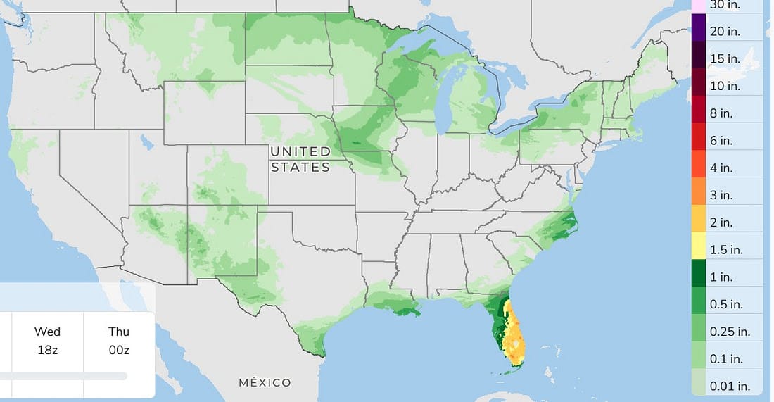 The heaviest rain in the U.S. over the next three days may be over the Florida Peninsula with some 1-2-inch totals. Anything in West Michigan today would be very light. There’s a better chance of some more significant rain on Thursday. Very little severe weather is expected in the U.S. over the next three days.