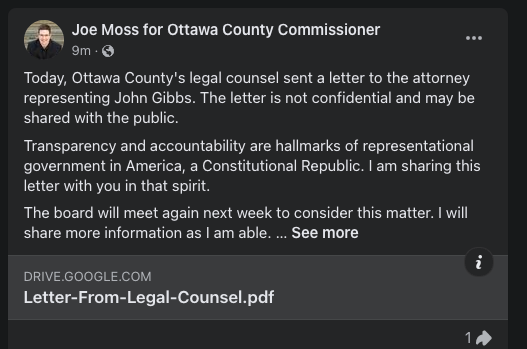 "Today, Ottawa County's legal counsel sent a letter to the attorney representing John Gibbs," Moss wrote in a since-deleted Facebook post on Feb. 23, 2024. "The letter is not confidential and may be shared with the public. Transparency and accountability are hallmarks of representational government in America ... I am sharing this letter with you in that spirit. The board will meet again next week to consider this matter. I will share more information as I am able."