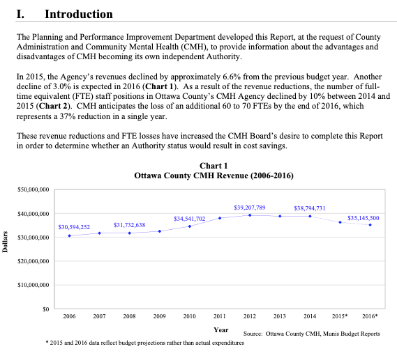 In 2015, the county’s CMH revenues declined by approximately 6.6% from the previous budget year and another decline of 3.0% was expected in 2016. This led to a 10% reduction in the department’s full-time employees between 2014 and 2015; at the time, it was anticipated that CMH would lose another 60-70 full-time employees by the end of 2016 — which would have resulted in a 37% reduction in the department’s workforce in a single year.