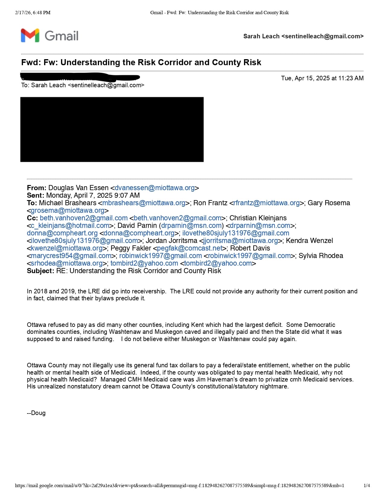 “It is my belief that Kent County CMH (Network 180) will drain the majority of the LRE’s ISF fund, which is used to cover Medicaid over expenditures,” Brashears wrote. “I am pushing this issue. (Even) though I am making progress in decreasing our projected Medicaid deficit, I am concerned that the LRE will not have the funds available to meet their obligations related to covering unexpected Medicaid deficits.”
