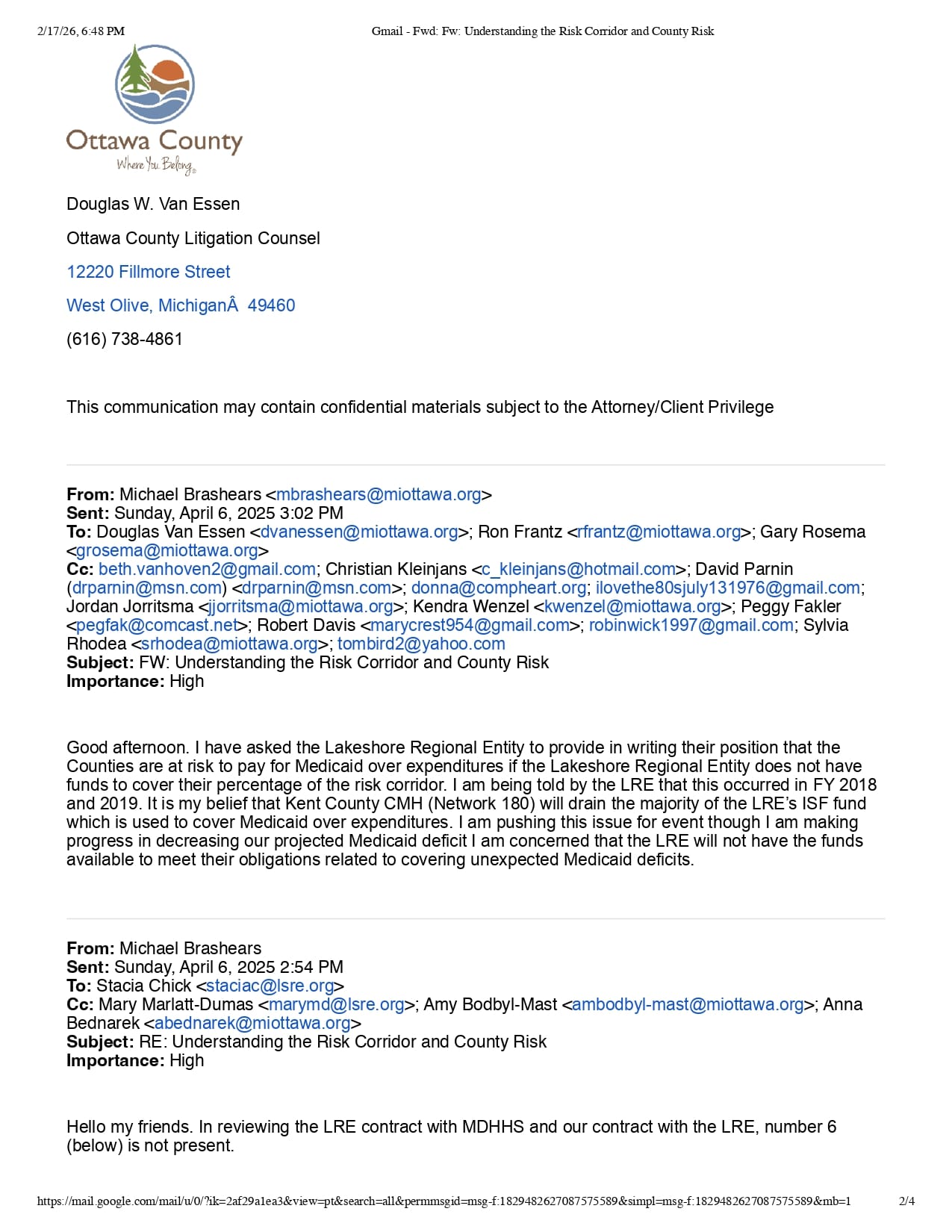“I have asked the Lakeshore Regional Entity to provide in writing their position that the counties are at risk to pay for Medicaid over-expenditures if the Lakeshore Regional Entity does not have funds to cover their percentage of the risk corridor. I am being told by the LRE that this occurred in (fiscal years) 2018 and 2019,” Brashears wrote.