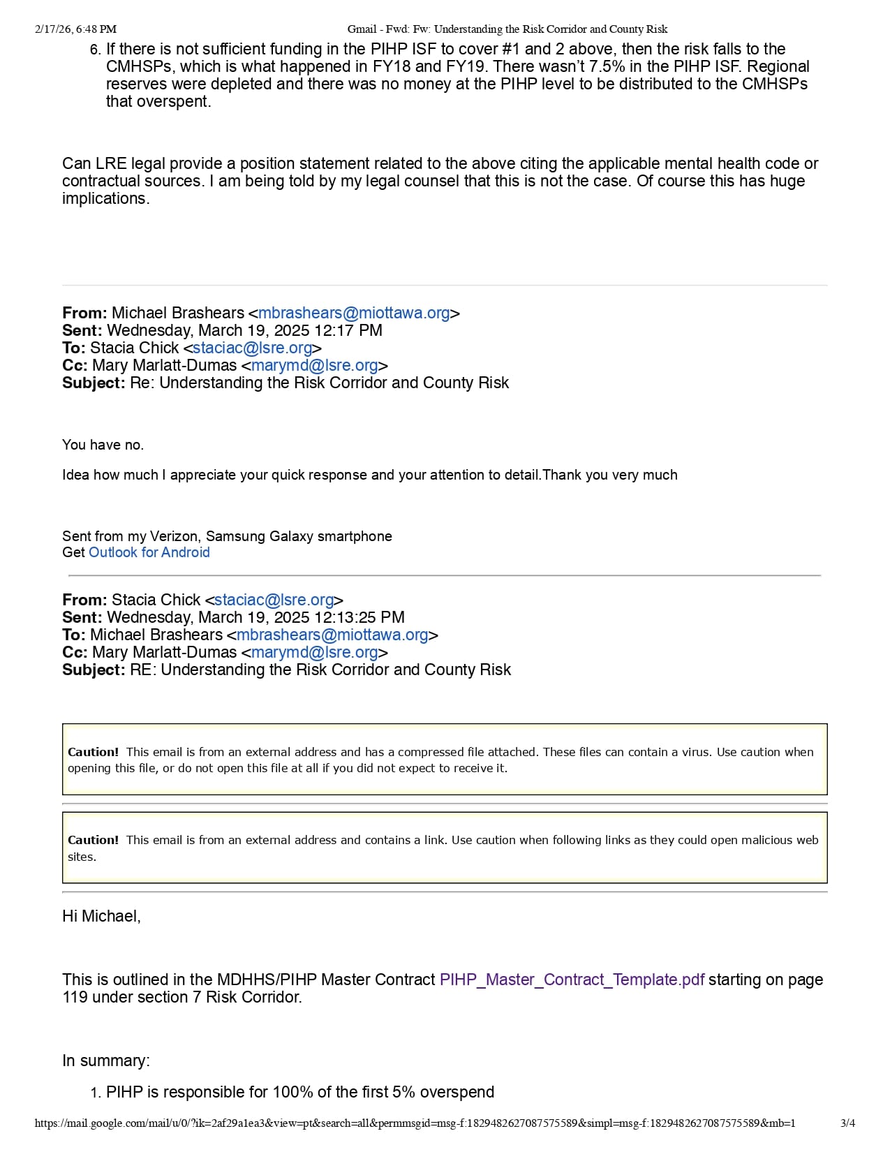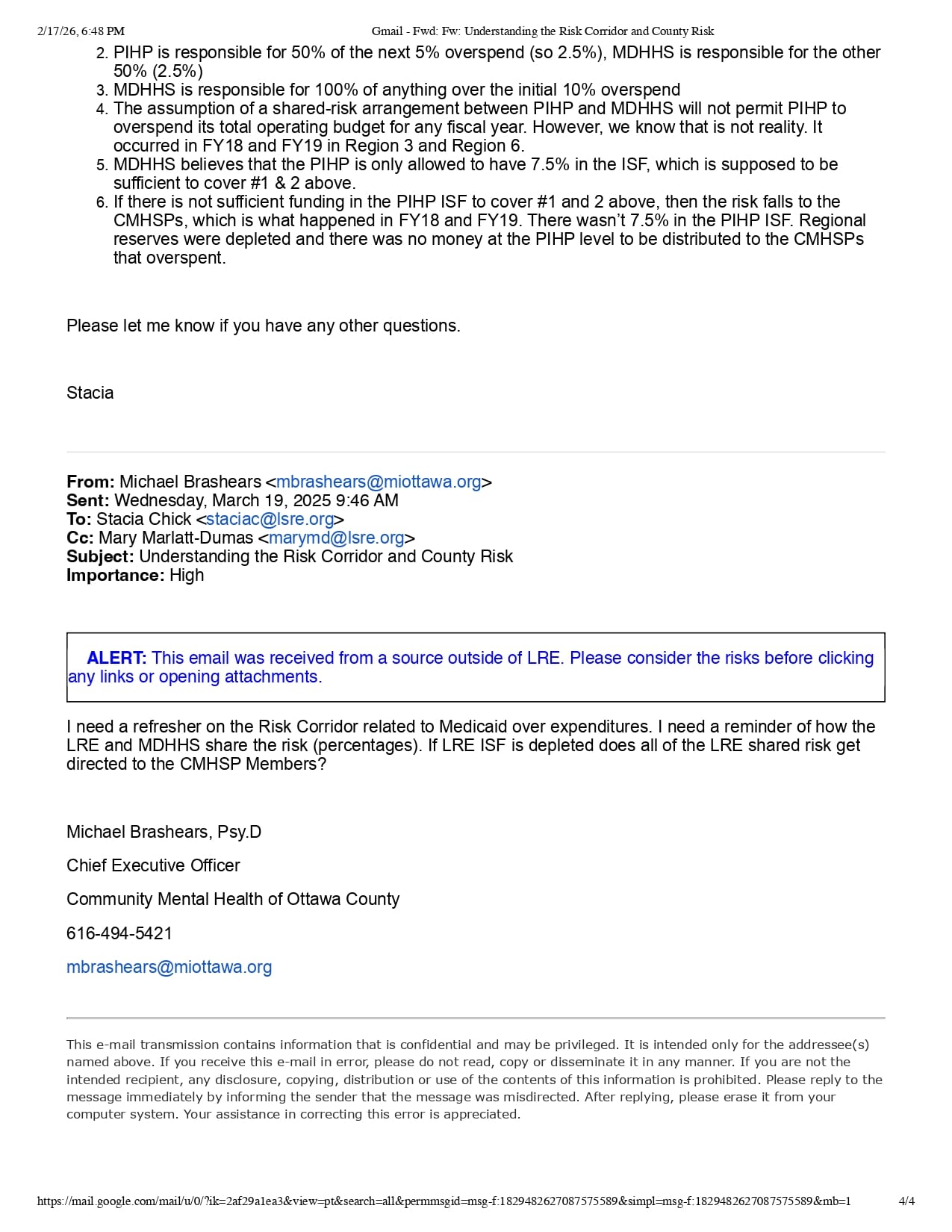 Two months later, Brashears emailed the LRE — the PIHP to which Ottawa County belongs — asking what the internal service fund within the LRE would cover in terms of Medicaid over-expenditures.