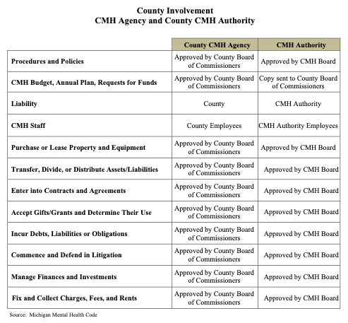 County commissioners were often wary of the massive financial risks associated with mental health, with often-unpredictable Medicaid costs year to year. The new law allowed them to "spin off" the CMH into a separate legal entity that shielded counties from the CMH’s debts or lawsuits.