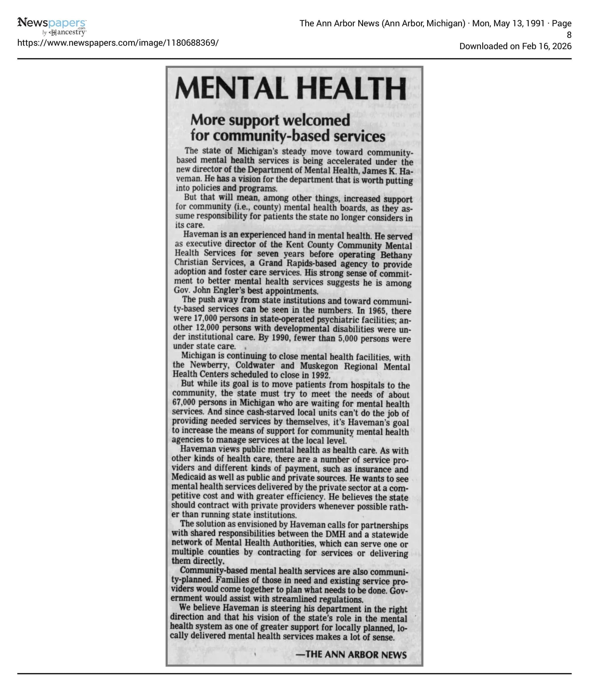 In 1991, The Ann Arbor News noted that, as of 1965, there were 17,000 people in state-operated psychiatric facilities and another 12,000 with developmental disabilities were under institutional care.