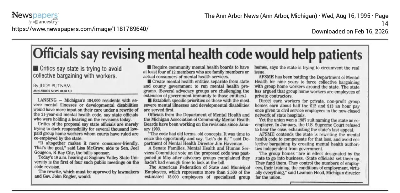 The American Federation of State and Municipal Employees, which in 1995 had been “battling the Department of Mental Health for nine years to force collective bargaining with group home workers around the state,” said the state was rewriting the mental health code to avoid collective bargaining with unions, The News reported in August 1995.