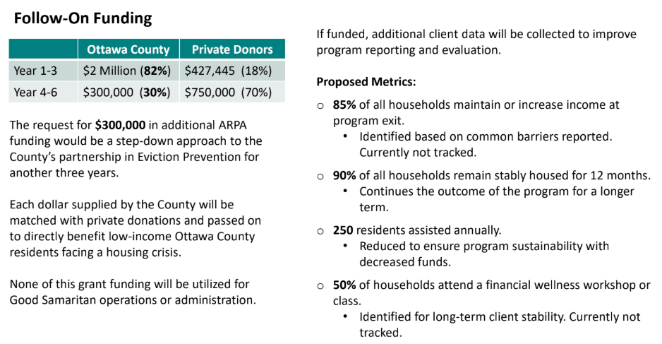 "These funds would be matched with private dollars. They'll be sent directly to Ottawa County landlords and they will stop an eviction process for both the landlord and the tenant," she said. "None of the dollars that you would contribute would be retained by Good Samaritan.