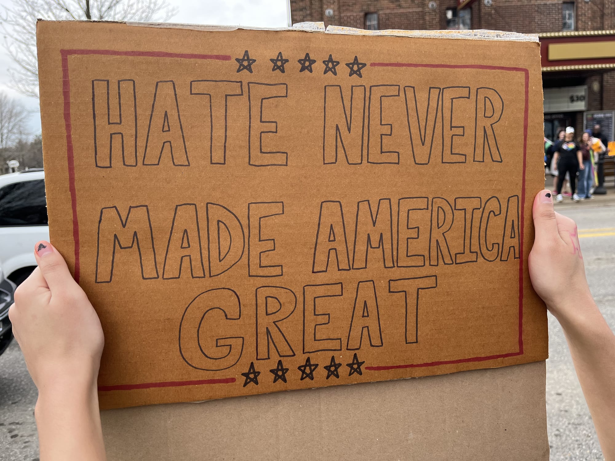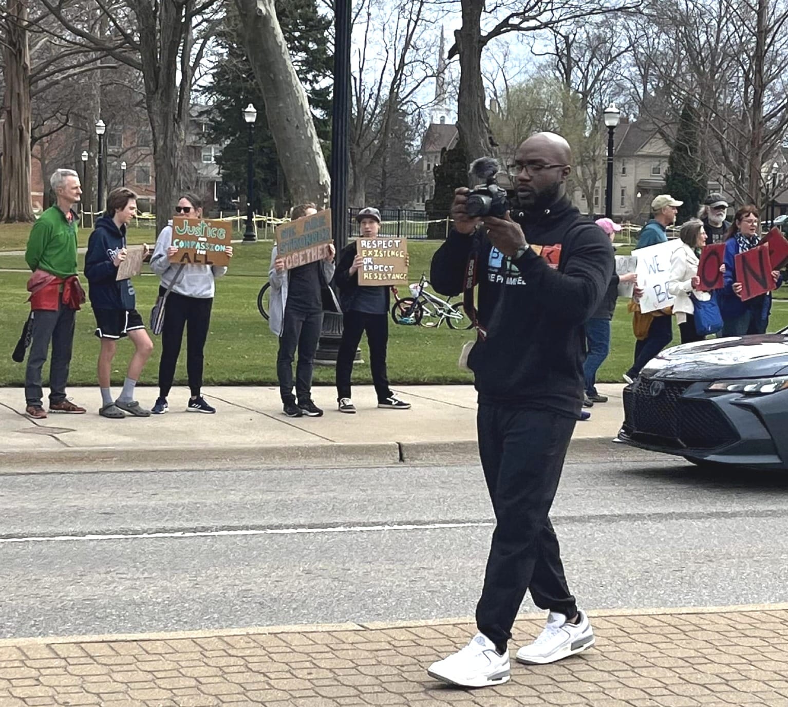 As the march arrived at Centennial Park, demonstrators lined both sides of South River Avenue, between 10th and 11th streets, and crowd members began chanting, “Everyone is welcome here!” as cars drove by.