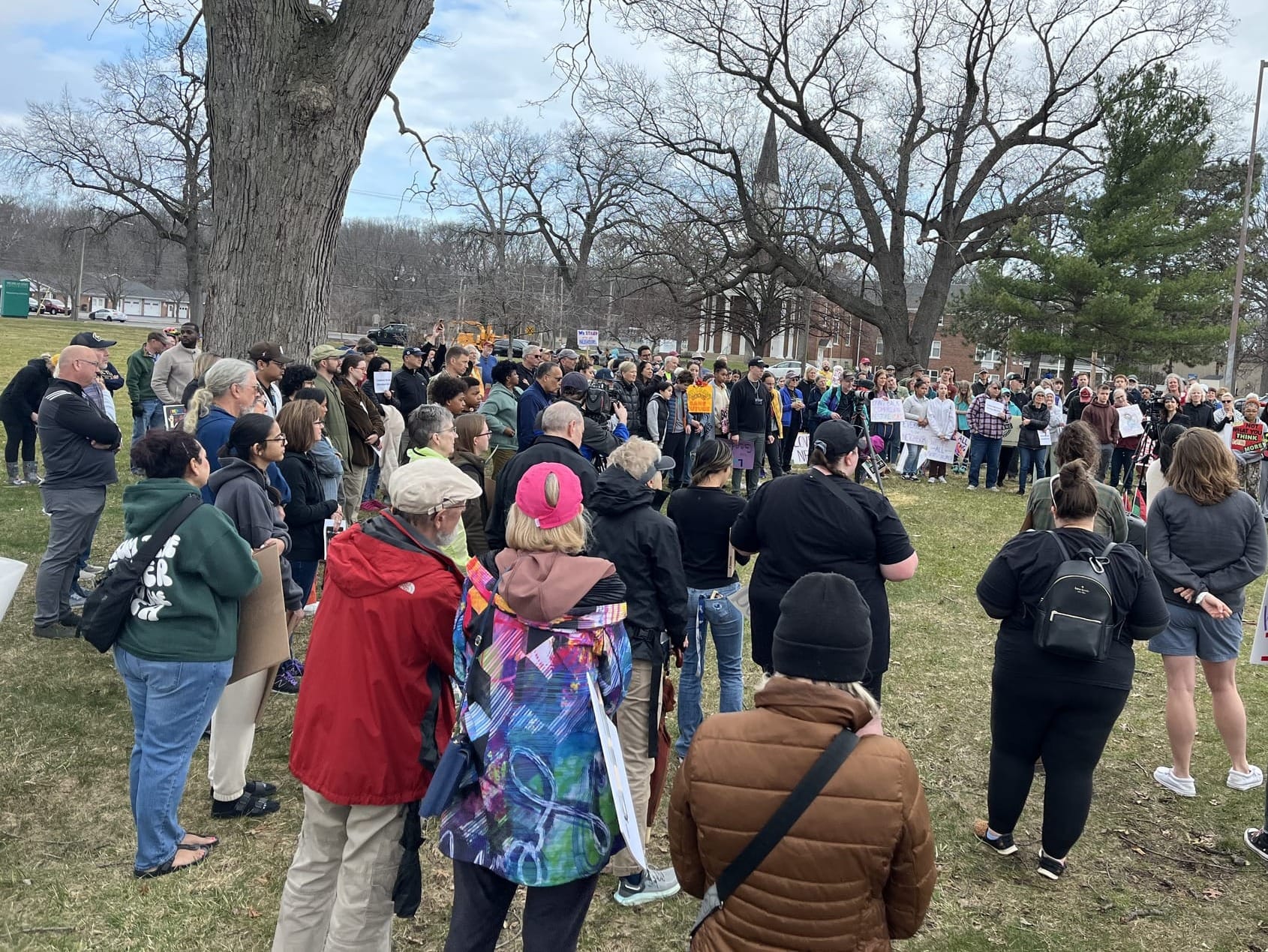 The crowd gathered around a mobile speaker in the parking lot, and listened to speeches from multiple community members.