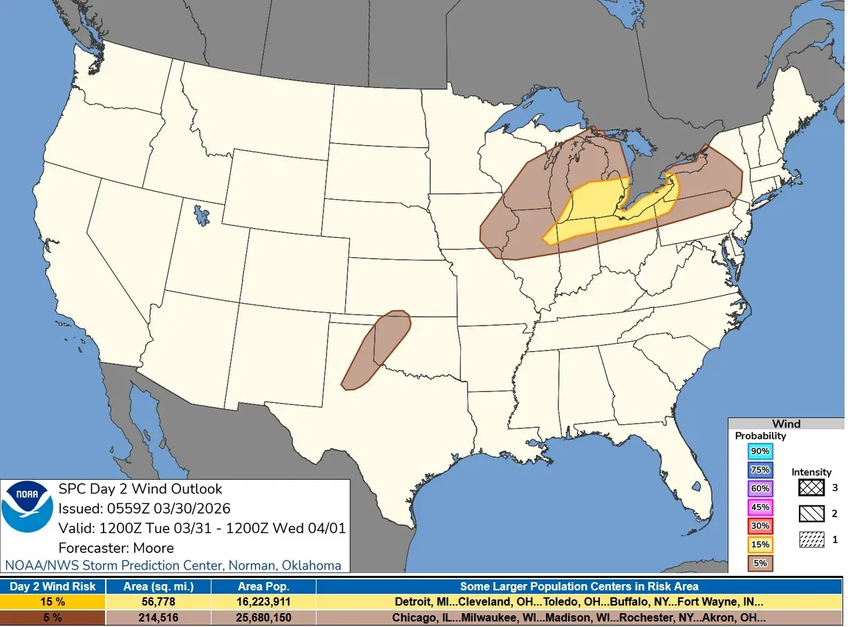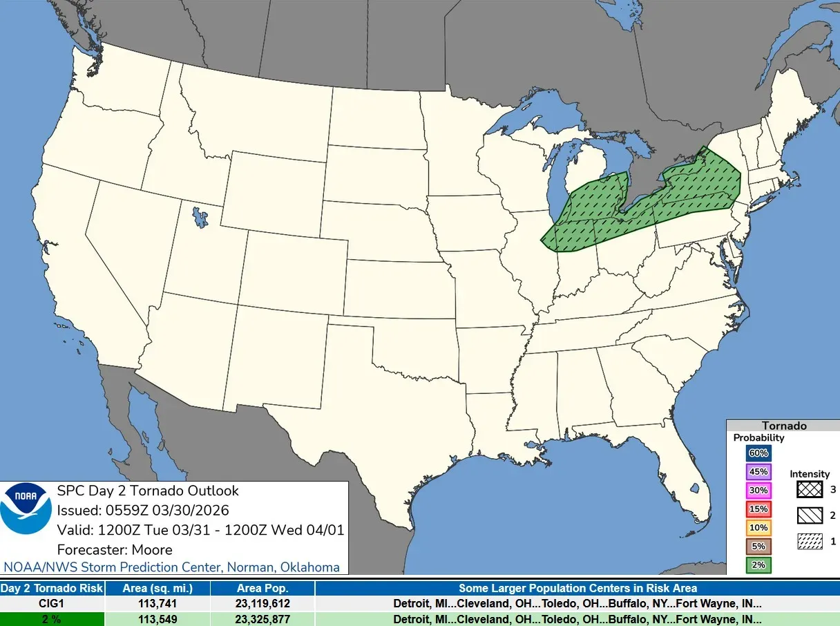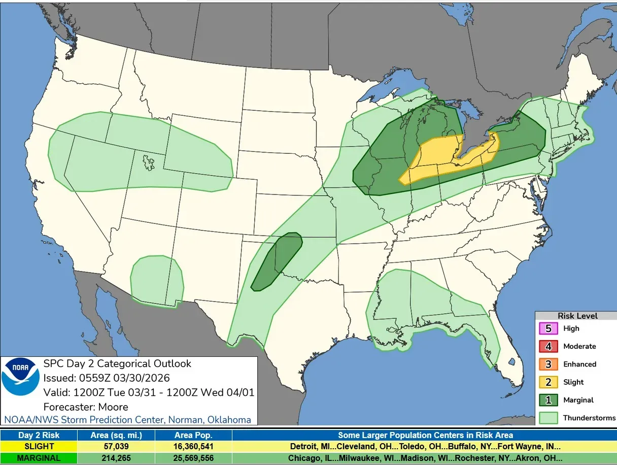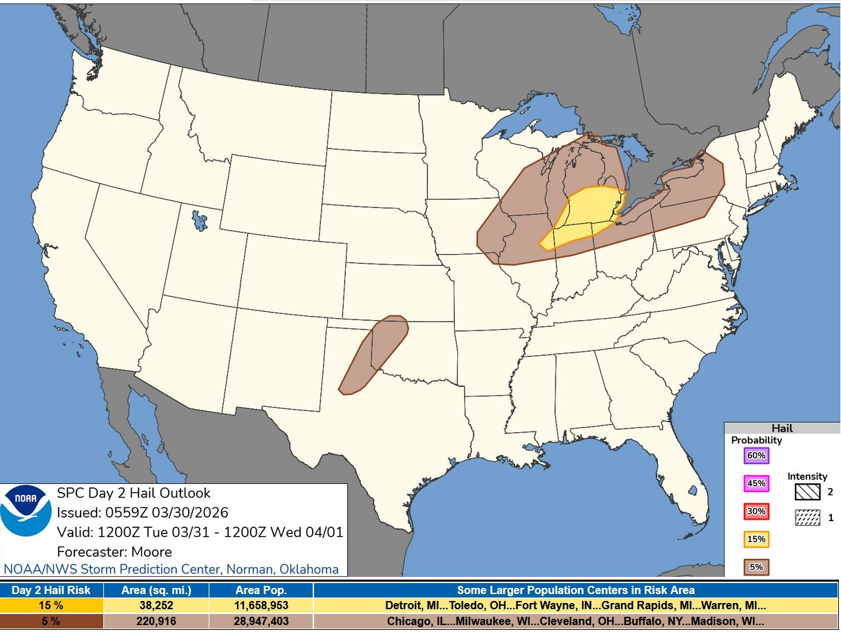 The above image is the Severe Weather Outlook Map for Tuesday/Tuesday night. There is a level 2 risk area (in yellow on the map above), for southern Lower Michigan, northern Indiana, northern Ohio and small parts of northeast Illinois, northwest Pennsylvania and western New York.
