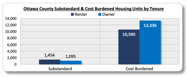 - Quality of households continues to be a challenge for many: There are approximately 1,454 renter households and 1,095 owner households in Ottawa County that live in substandard housing conditions, meaning they live in units that are overcrowded or lack complete plumbing or kitchens. There are approximately 10,590 renter households and 13,336 owner households in Ottawa County that are housing cost burdened (paying more than 30% of income toward housing costs), of which 4,783 renter households and 4,769 owner households are severe cost burdened (paying over 50% of income toward housing costs). As a result, many households are living in housing conditions that are considered to be below modern-day housing standards and/or are not reasonably affordable to many area households.