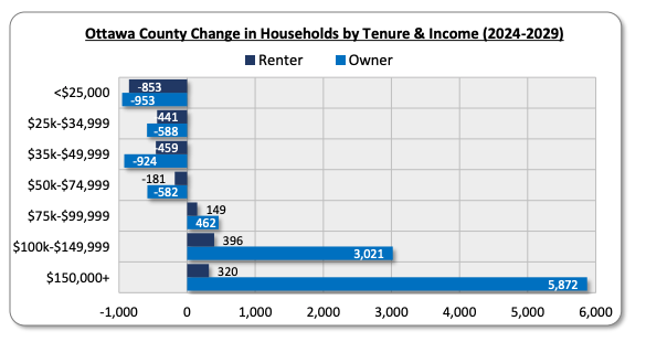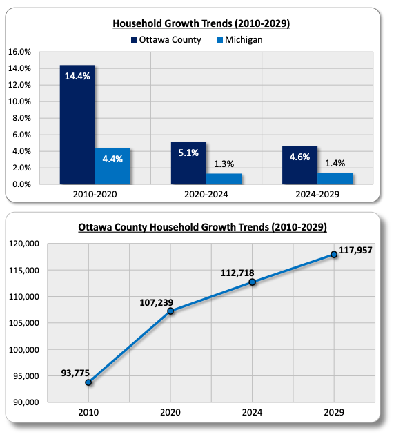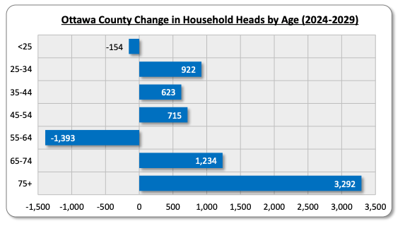 - Notable growth is expected among seniors (age 65 and older): In 2024, household heads between the ages of 35 and 44 comprised the largest individual share (17.7%) of all households in Ottawa County, followed by households ages 55 to 64 (17.4%) and ages 45 to 54 (16.1%). Between 2024 and 2029, the most significant growth (22.0%) is projected to occur among households aged 75 and older. This will likely result in increased demand for senior-oriented housing, though other housing types will also be needed.