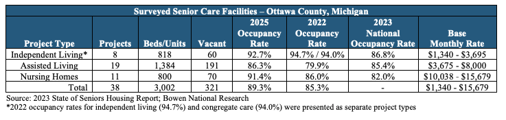 - Senior care housing has high occupancy levels,, and projected growth will add to demand: A total of 38 senior care facilities, including independent living, assisted living and nursing homes, were surveyed in the county. These facilities have overall occupancy rates that range from 86.3% (assisted living) to 92.7% (independent living) and a total occupancy rate of 89.3% in the county. All senior housing types have higher overall occupancy rates than the 2023 national occupancy rates.