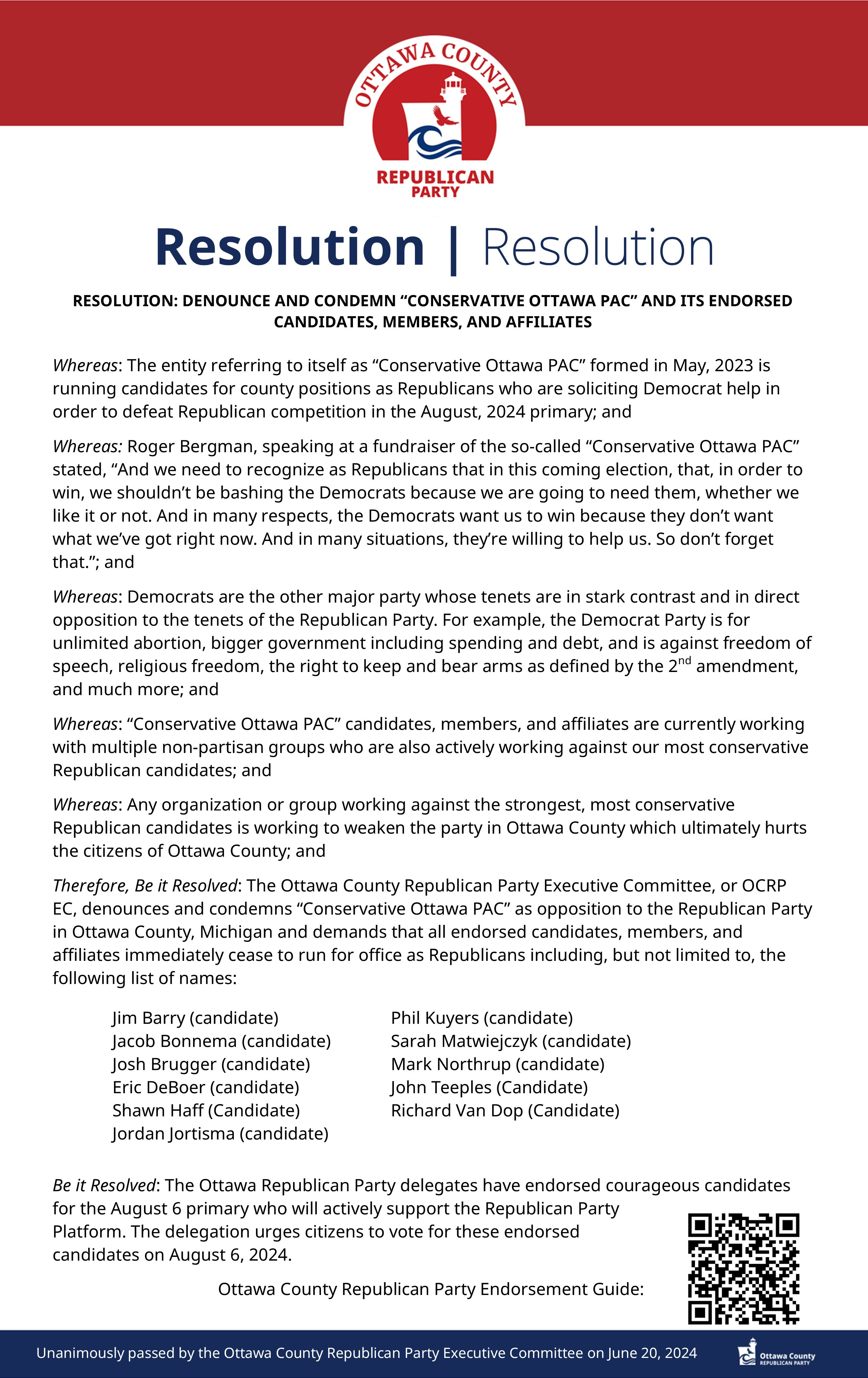 “The entity referring to itself as ‘Conservative Ottawa PAC’ formed in May 2023 is running candidates for county positions as Republicans who are soliciting Democrat help in order to defeat Republican competition in the August 2024 primary,” the county GOP said in the June 25 resolution.