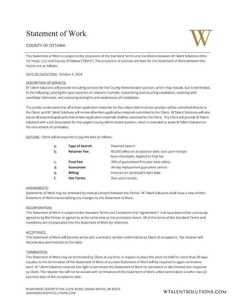 OTTAWA COUNTY — Ottawa County will likely spend a minimum of $63,000 to the talent firm it has “engaged” to search for its next county administrator.