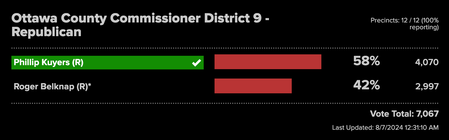 Kuyers ran again in 2024, this time beating Belknap by 16 points.