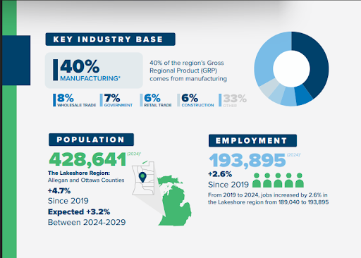The report, compiled by Lakeshore Advantage from interviews with more than 130 local executives between July 2024 and June 2025, paints a picture of a dynamic region that continues to be heavily anchored by its industrial base. Manufacturing is powering the two-county area, generating 40 percent of the gross regional product.