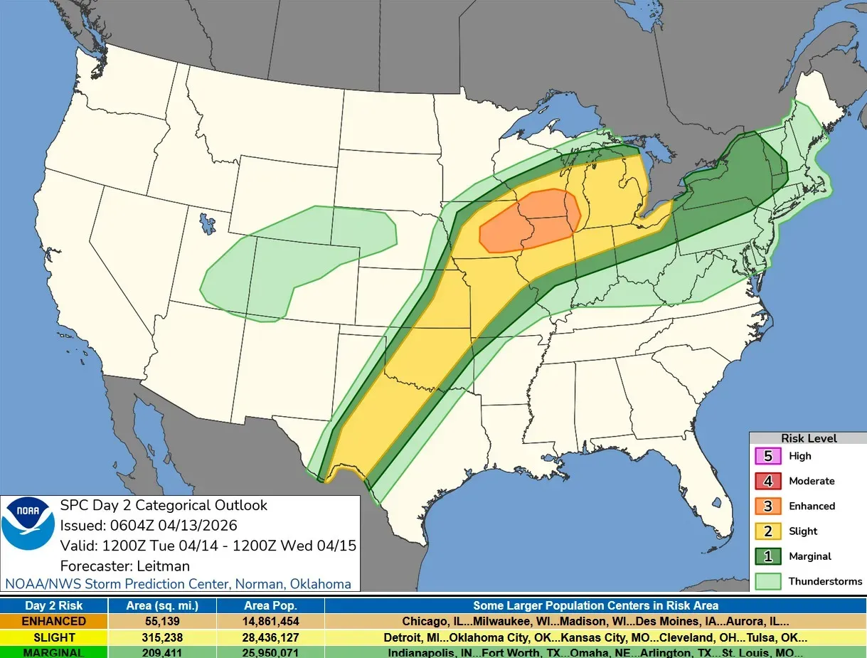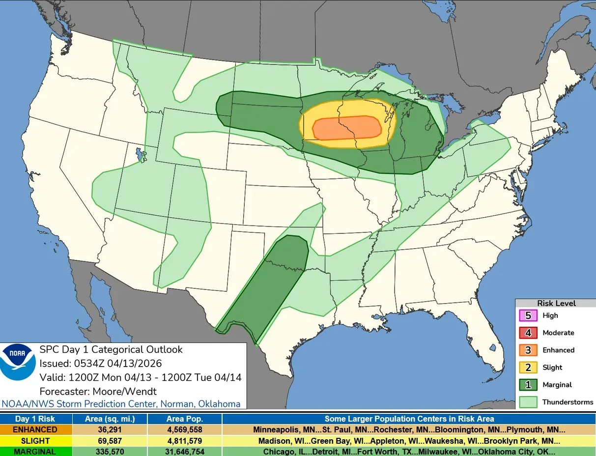 Here’s the Severe Weather Outlook from the Storm Prediction Center. Lower Michigan is in the dark green Marginal Risk Area. SPC says: “Severe thunderstorms are likely across the Upper Mississippi Valley and Great Lakes region with potential for large to very large hail, damaging wind, and tornadoes.”