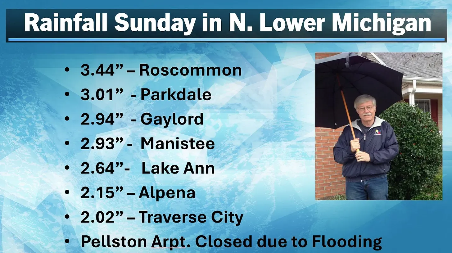 Look at the rainfall across N. Lower Michigan. Significant flooding was noted on the Crooked River and the water from Black Lake was approaching homes along the lake.