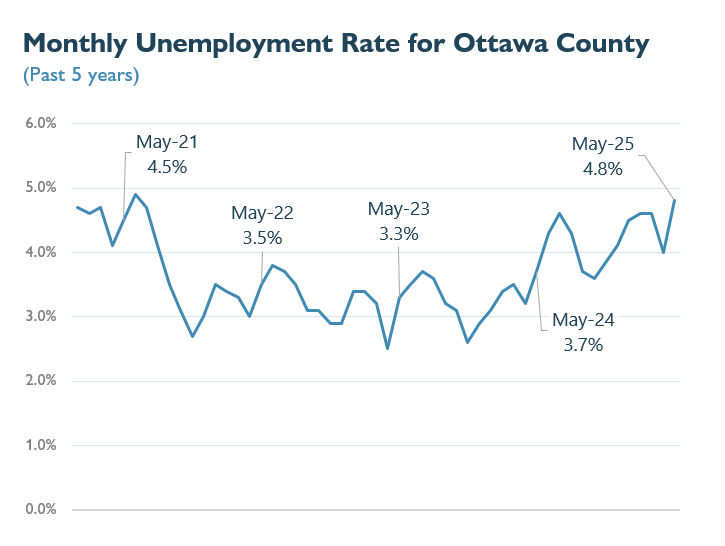 - Ottawa's June unemployment rate of 5.1 percent was the highest since September 2020 (5.6 percent) when the state was recovering from the worst of the pandemic. Excluding 2020, unemployment rates for the county haven't been this high since the summer of 2014.