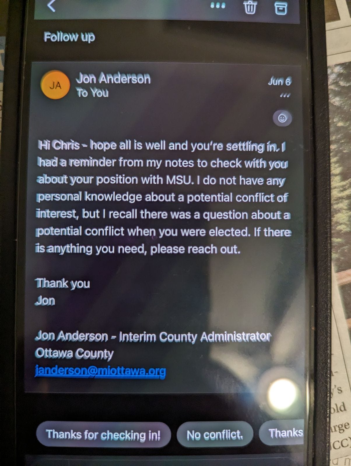 “Hi Chris - hope all is well and you’re settling in,” Anderson wrote. “I had a reminder from my notes to check with you about your position with MSU. I do not have any personal knowledge about a potential conflict of interest, but I recall there was a question about a potential conflict when you were elected. If there is anything you need, please reach out.”