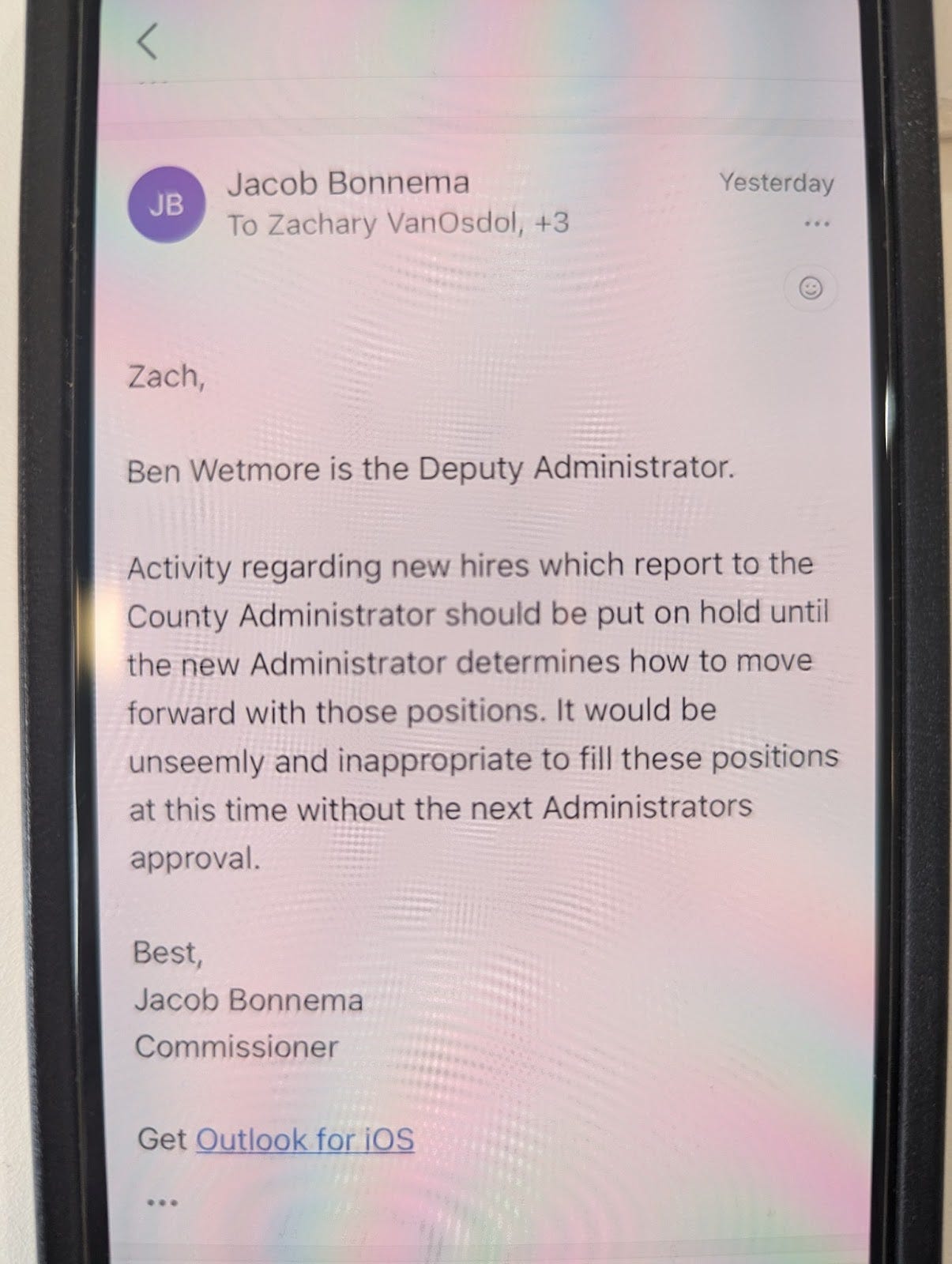 “Activity regarding new hires which report to the county administrator should be put on hold until the new administrator determines how to move forward with those positions,” Bonnema wrote in an email Oct. 14 in response to VanOsdol and his fellow commissioners. “It would be unseemly and inappropriate to fill these positions at this time without the next administrator’s approval.”