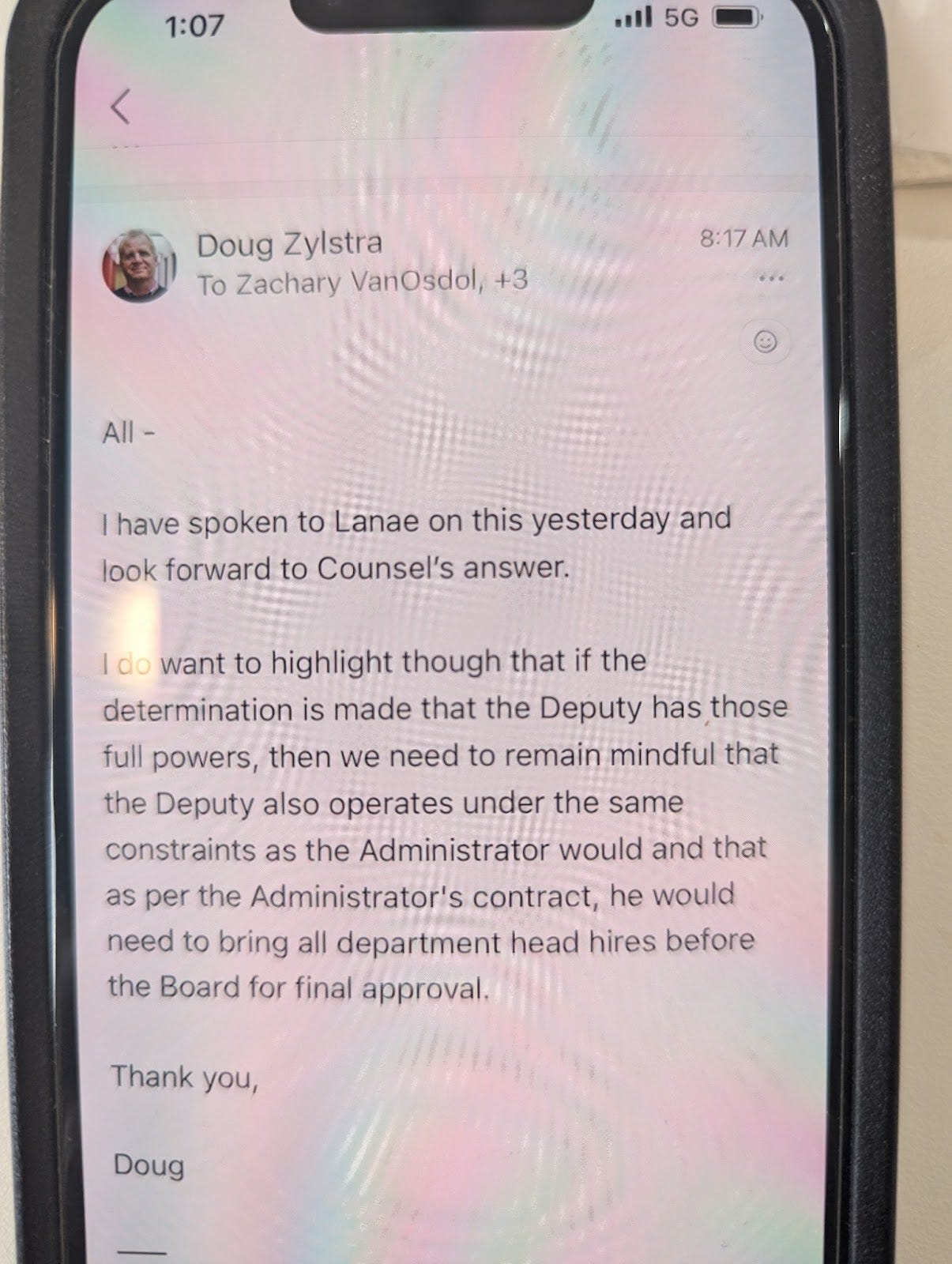 “I do want to highlight though that if the determination is made that the deputy has those full powers, then we need to remain mindful that the deputy also operates under the same constraints as the administrator’s contract, he would need to bring all department head hires before the board for final approval,” Zylstra wrote.