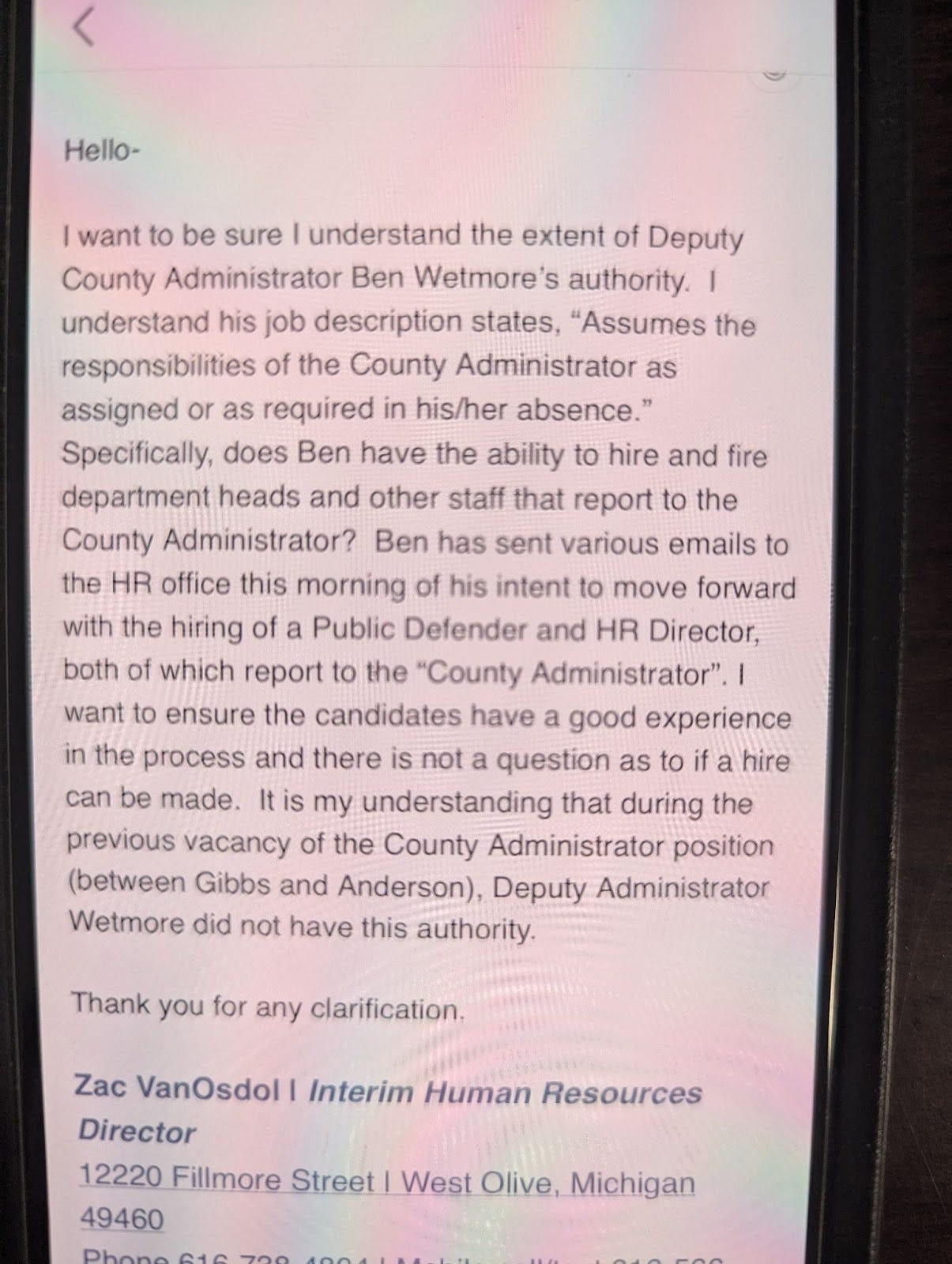 VanOsdol went on to explain that Wetmore “has sent various emails to the HR office this morning of his intent to move forward with the hiring of a public defender and HR director, both of which report to the ‘county administrator.’ I want to ensure the candidates have a good experience in the process and there is not a question as to if a hire can be made.
